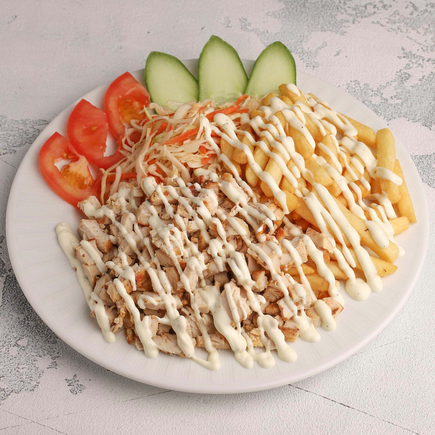 Филе индейки на мангале, лаваш армянский тонкий , капуста, морковь по корейский , огурцы (свежие),помидоры , фирменный белый соус, картофель фри